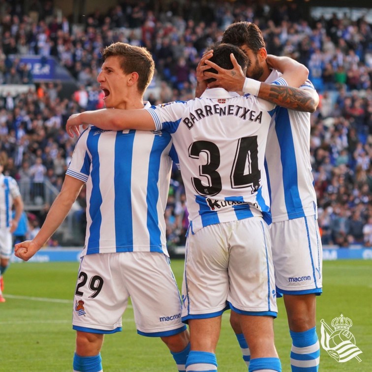 Una grande, anzi una grandissima Real, ha vinto per 3-1 con un pessimo Real Madrid. Una vittoria meritata, anzi meritatissima, che da ancora qualche vaga speranza di una qualificazione europea. Dopo neanche 6 minuti di gioco, le merengues vanno subito in vantaggio, ma la Real non si fa attendere, e poco dopo pareggia grazie a una rete di Mikel Merino. Dopo qualche tentativo del Madrid, la Real sfiora il vantaggio, ma un intervento con la mano di Vallejo su Willian José, evita la rete txuriurdin, ma non il rigore e l’espulsione del giocatore madridista. Purtroppo però io brasiliano si fa parare il rigore, e finisce così il primo tempo. Il secondo tempo è praticamente di marca txuriurdin, che dominano il match, e lo dimostrano andando in vantaggio grazie ad un gran gol di Zaldua. Passano pochi minuti, e la Real segna nuovamente grazie a una rete del giovane Barrenetxea, il suo primo gol nelle Liga. Il ragazzo ha classe da vendere, e ha solo 16 anni. Grande partita anche di capitan Oyarzabal, sfortunato protagonista con un palo ed una rete annullata. Verso la fine del match, Imanol Alguacil, fa entrare in campo Januzaj, che prende subito un palo, Illaramendi assente da un lungo periodo causa infortunio, e Juanmi, che disputa il suo ultimo match a San Sebastian. Insomma dopo la vittoria delle neskak, un’altra bella giornata. Peccato però, perché se avessimo giocato sempre così, ora saremmo a contenerci un posto in Champion… Aupa la Real!