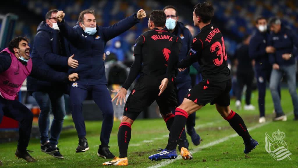 Proprio quando sembrava tutto finito, è arrivata la zampata vincente di Willian Jose, e la vittoria del Rijeka contro l’Az per 2-1. Insomma 5 minuti di pura follia, di agonismo e di magia. La Real aveva comunque iniziato alla grande la partita inaugurale del ‘nuovo’ stadio Diego Armando Maradona. Primi quindici minuti da grande squadra, con un paio di ottime occasioni, di cui una divorata da Portu su passaggio di Willian Jose. Però è il Napoli ad andare in vantaggio grazie ad una rete di Zielinski. Secondo tempo sempre in attacco da parte degli uomini di Alguacil, che sfiorano il pareggio con Mikel Merino. Il Napoli comunque fa paura nelle ripartenza, e sfiora il raddoppio. Al 91’ il miracolo con la rete dell’eterno brasiliano. Il 2 a 1 dei croati, e 3 minuti di melina del Napoli, e alla fine l’apoteosi. È fatta! Siamo ai sedicesimi. Abbiamo un’ottima squadra, giovani sempre più promettenti, e un grande allenatore. Aupa la Real!