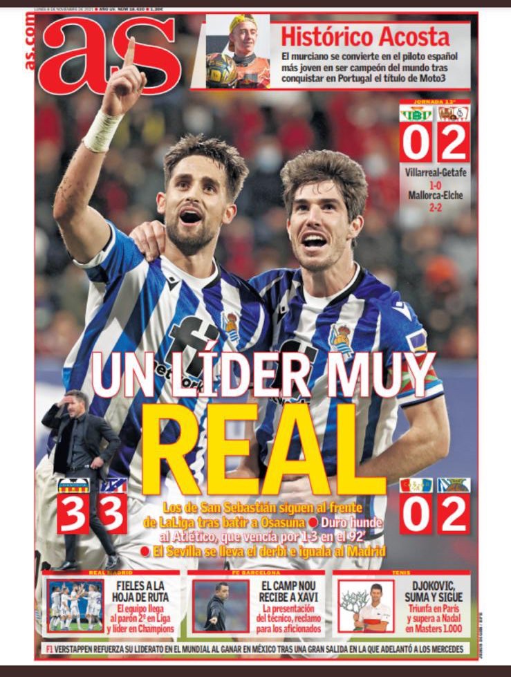 La Real con una partita importante, si prende tre difficilissimi punti sul campo dell’Osasuna, e si mantiene primo in classifica a 28 punti con un punto di vantaggio sulla coppia Real Madrid & Siviglia, che però hanno un punto di meno. Non si poteva desiderare una situazione migliore prima della sosta per le nazionali. Un primo tempo giocato alla pari, dove la Real ha anche rischiato un po’. Ma il secondo da manuale. Grande prestazione di Mikel Merino, vero leader della squadra. Suo il primo gol, dopo aver rischiato anche di farsi molto male. Una rete che non ha festeggiato, in quanto da buon navarro, Pamplona e l’Osasuna sono la sua vera casa. Il secondo gol e che mette al sicuro il risultato per la Real è di Januzaj, anche lui autore di una prova superba. Un rigore perfetto il suo. E ora godiamoci la sosta. Anche perché dopo ce la dovremo vedere con il Valencia in Liga e con il Monaco in trasferta in Europa League. Per quanto riguarda il Sanse, ennesima sconfitta degli uomini di Xabi Alonso che perdono anche con l’Ibiza in casa. Ennesima vittoria invece per le neskak, che disintegrano il Betis per quattro reti a zero. Aupa la Real!