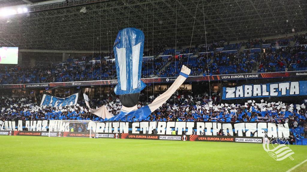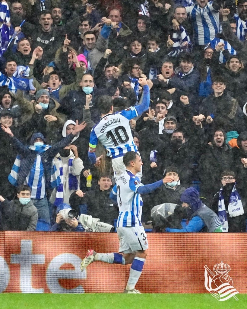 Dopo un primo tempo inguardabile dove il Psv ha sfiorato diverse volte un meritato vantaggio, la Real rientra trasformata in campo. Nonostante la pioggia battente che da giorni sta martoriando San Sebastian, gli uomini di Alguacil cambiano registro. Prima guadagnano un rigore che capitan Oyarzabal trasforma, e poi raddoppiano con lo stesso giocatore. La Real inizia a produrre gioco, e sfiora la terza rete in svariate occasioni. Il Psv resta in dieci, e i txuriurdin ne approfittano per segnare il terzo e definitivo gol con Sorloth. Una vittoria sofferta, ma meritata alla fine. Una vittoria che oltre che a portare gli uomini di Alguacil ai sedicesimi di finale della Europa League, da morale e forza per il delicatissimo match di domenica contro il Real Betis. Presenti sugli spalti di Anoeta circa 25mila impavidi che hanno sfidato la pioggia torrenziale pur di sostenere i propri beniamini. Omaggio da parte della grada Zabaleta proprio al defunto tifoso txuriurdin scomparso 23 anni fa. Aupa la Real!
