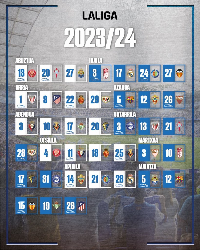 È uscito il nuovo calendario della Liga 2023/24. La Real debutterà il 13 agosto tra le mura amiche contro il Girona. Il 20 di agosto ancora in casa contro il Celta. Il primo derby contro l’Athletic il primo di ottobre. Il 5 novembre sempre in casa contro il Barcellona, mentre il 17 settembre a Madrid contro il Real. Aupa la Real!