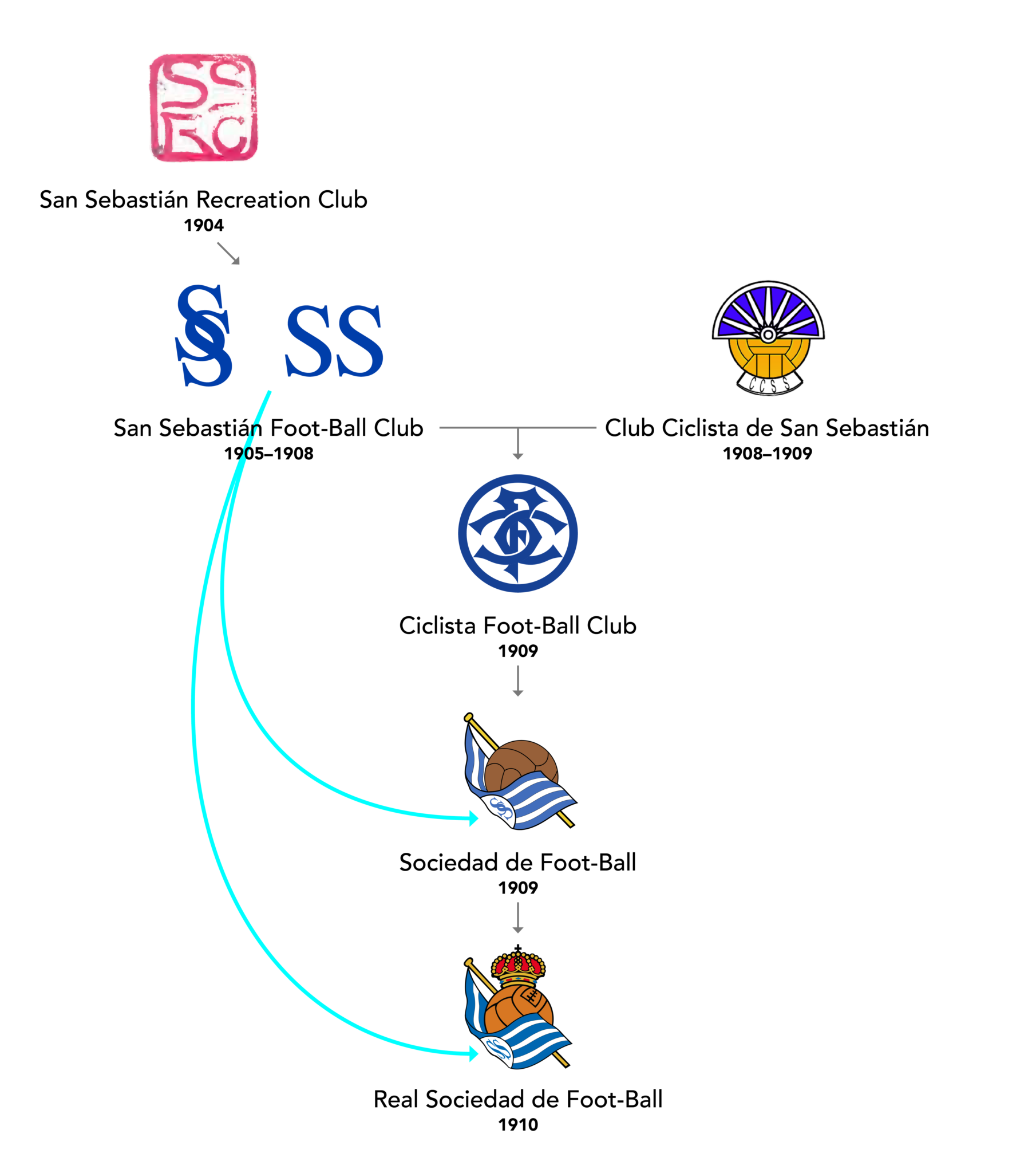 Grazie all’incredibile lavoro di documentazione di Atotxa.org, siamo venuti a conoscenza dell’importantissimo di alcuni dettagli fondamentali nella lettura della storia della Real Sociedad. Stiamo parlando del Ciclista Football Club. Il ‘vero’ club progenitore dell’attuale Real Sociedad de Futbol cosi come la conosciamo. La storia ufficiale afferma che il club donostiarra sia nato nel 1909 in seguito ad una scissione del San Sebastián Sport Club, prima società sportiva storica della città. Nello stesso anno la squadra fu iscritta al campionato con il nome di Club Ciclista de San Sebastián, e con questa denominazione il club vince la sua prima Coppa del Re, battendo il Club Español de Madrid per 3 gol a 1. In realtà la storia è un po’ più complessa, e come anticipato poco fa, il Ciclista Football Club è un tassello fondamentale nella storia del club. Il Ciclista Football Club nasce nel 1908 dalla fusione proprio del Club Ciclista de San Sebastián e il San Sebastián Sport Club, per la precisione il 29 novembre del 1908. Ed è proprio grazie a questa unione che il club ottiene la registrazione presso il registro civile come società calcistica. Lo stemma del club è formato semplicemente da un monogramma formato dalle lettere CFC, che altro non sono che le iniziali del Ciclista Football Club. Ed è proprio con questa denominazione (e non Club Ciclista de San Sebastián) che il club txuriurdin vince la sua prima Coppa del Re. E grazie a questa vittoria la Real sarà membro fondatore della futura Liga nel 1928. Il monogramma CFC è stato ricreato grazie alla grande opera di ricerca e documentazione di Atotxa.org. Non sarebbe male se in futuro la direzione della Real Sociedad prendesse in considerazione l’idea di apporre lo stemma del Ciclista Football Club sulla terza maglia da gioco. Un bel modo per onorare la propria storia, e celebrare la vittoria del primo trofeo nella storia del club. Magari nel 2029, in occasione del 120° anniversario della società e appunto della vittoria della prima coppa. Aupa la Real!