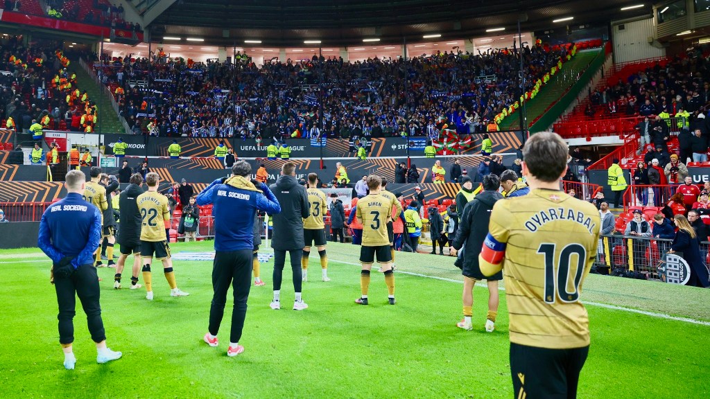 Ci sta perdere an Old Trafford, anche contro uno dei peggiori Manchester United della storia, ma non così. Man of the match il sig. Benoit Bastien, arbitro dell’incontro. Protagonista assoluto. Ben tre rigori concessi, uno iniziale in favore della Real trasformato da capitan Oyarzabal, e poi ben due, molto dubbi, o per lo meno leggeri regalati ai Red Devils. Io ciliegina sulla torta l’espulsione molto severa di Aramburu, che ha letteralmente spezzato le gambe ai giocatori txuriurdin. Dall’altra parte però bisogna anche ammettere che la Real non ha mai imposto il proprio gioco. Una squadra senza idee. Ora cerchiamo di salvare un minimo la stagione, risalendo in campionato, e puntando alla qualificazione Conference League. Inoltre c’è da onorare la semifinale di ritorno della Coppa del Re. Potremmo anche farcela. A fine stagione spero ci sia un radicale cambio al timone della squadra. Si è chiuso un ciclo. Onore ai 2000 realzales che non hanno mai smesso di incitare la squadra.